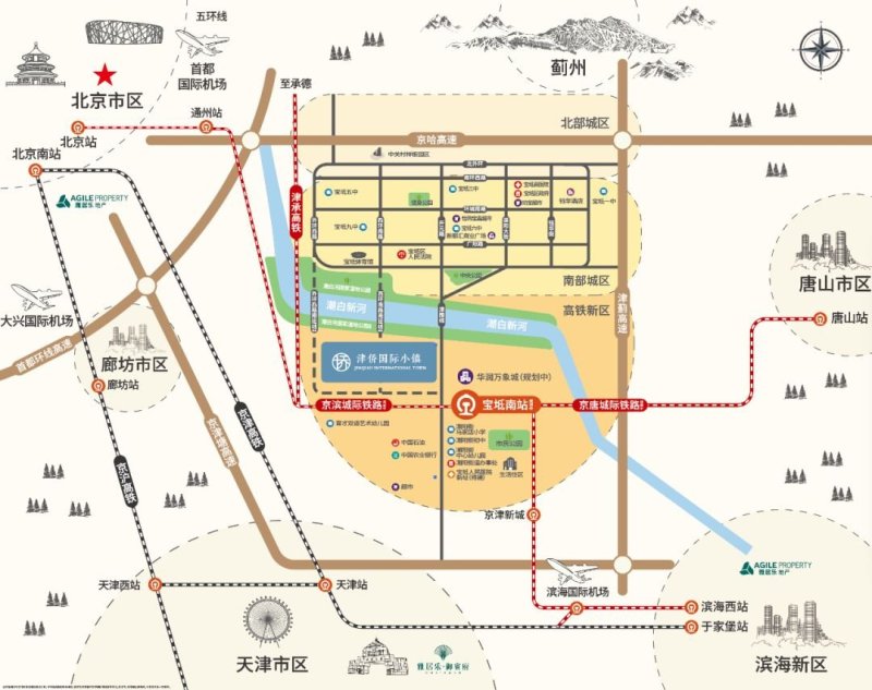 隨著高鐵新城建設進程的提速,未來城市南移將帶動人口的大流動。雅居樂·津僑國際小鎮作為高鐵新城的時代封面,是推動寶坻高鐵經濟發展的“排頭兵”,更是打造展現寶坻城市形象的新窗口,發展重點;大量資源、配套、政策向此傾斜。本次首開產品更是地塊內距離高鐵站最近的產品,舉步即達,未來京唐、京濱、津承三條城際線路交匯于此,寶坻將成為天津、北京、唐山三城經濟區交匯中心點。不久的將來,從此至北京通州僅需18分鐘,半小時內抵達天津市區、唐山、濱海新區。寶坻的跨越發展,觸手可及,居于此的生活,即可享受京津冀城市圈生活的繁華與便利。